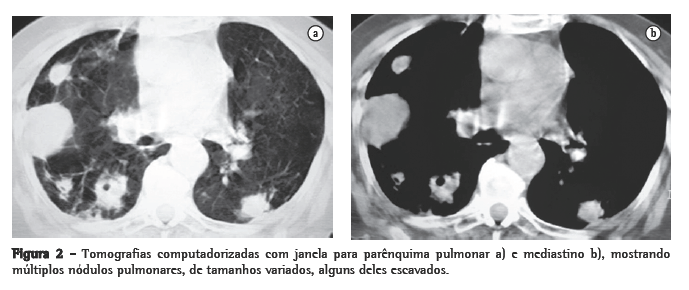 Nódulos, massas escavadas, derrame pleural, pneumotórax, opacidades em vidro fosco e padrões intersticiais podem também ocorrer.(1,4,5,11) Alguns estudos mostram que, em pacientes HIV positivos, existe um percentual maior de lesões escavadas.(8) A consolidação alveolar nos lobos superiores é muitas vezes confundida com tuberculose pulmonar.(6) Embora as alterações vistas na TC sejam ­semelhantes às das radiografias convencionais, a TC é superior na demonstração da exata localização e extensão das lesões, assim como na diferenciação entre lesões pulmonares e pleurais.(5) No caso relatado, a paciente apresentava imagens nodulares de tamanhos variados, disseminadas por ambos os pulmões, e algumas delas escavadas.