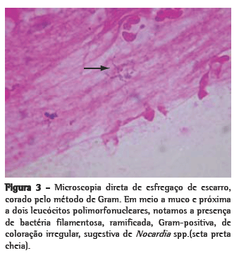 Foi realizada tomografia computadorizada (TC) do tórax, que confirmou a presença dos nódulos com tamanhos variados, sendo alguns escavados (Figura 2). Três amostras seguidas de escarro com pesquisa de bacilos álcool-ácido resistentes e fungos (coloração pela prata) foram negativas. A bacterioscopia (Gram) mostrou a presença de bactérias filamentosas nas três amostras colhidas de escarro, fortemente sugestivas de Nocardia spp., confirmada pela coloração de Ziehl- Neelsen, mostrando a característica resistência parcial à solução álcool-ácido (Figura 3).