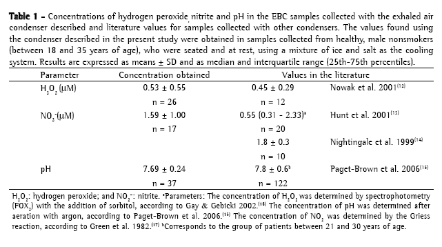 Various parameters, such as markers of inflammation, remodeling and tissue oxidative damage, have been determined in EBC ­samples­.­(2,3) Using the EBC condenser described in the present study, the concentrations of hydrogen peroxide, nitrite and pH were determined by different methods (Table 1), as were the concentrations of malondialdehyde,(7) 8-­isoprostane and protein (data not shown). Although our condenser was not directly compared with others, the values revealed by the chemical analysis of the samples collected using the EBC condenser described here are at a level similar to previously reported values obtained using other condensers in healthy subjects (Table 1). In the future, this comparison should be carried out in order to allow a statistical analysis, which was not performed in the present report.