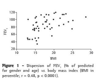 The moderate relationship found between nutritional status and FEV1 (Figures 1 and 2) in the patients in our sample is probably due to the fact that decreased pulmonary function cannot be explained solely by increased impairment of nutritional status. Noncompliance with treatment and noncompliance with regular respiratory therapy are examples of other factors that destabilize pulmonary function.
