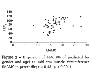 The mild impairment of pulmonary function presented by most of the patients in our sample might have played a role in the tendency (p < 0.06) toward an association between pulmonary function and nutritional status assessment based on MAMC. In cases of mild pulmonary impairment, nutritional depletion occurs due to other factors, such as the type of genetic mutation, pancreatic insufficiency, loss of bile salts and acids, gastroesophageal reflux, intestinal resection and the emotional status of patients. Therefore, the pathophysiology of malnutrition found in the present study is similar to that of primary malnutrition, which retains muscle mass at the expense of fat mass.