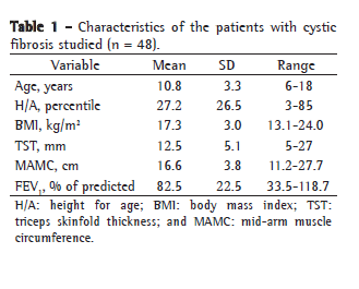 This was a cross-sectional descriptive study involving 48 children and adolescents with CF, according to the diagnostic criteria established in the Cystic Fibrosis Foundation consensus.(9) The study inclusion criteria were as follows: being between 6 and 18 years of age; and being under treatment at the Nutrition Outpatient Clinic of the Oswaldo Cruz Foundation Instituto Fernandes Figueira (IFF, Fernandes Figueira Institute). Patients with diabetes or liver disease were excluded. The research project was approved by the IFF Research Ethics Committee. The legal guardians of all participating patients gave written informed consent.