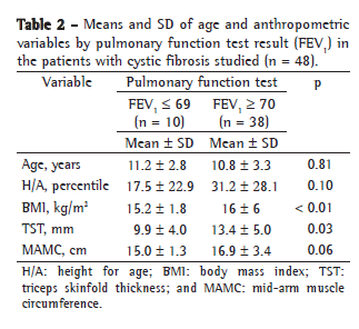 The objective of the present study was to evaluate the association between nutritional status, determined based on anthropometric and body composition indices, and pulmonary function in children and adolescents with CF treated at a referral center in the city of Rio de Janeiro.