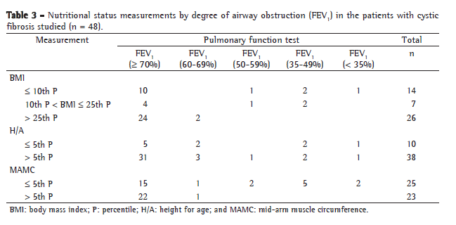 Objective: To evaluate the association between nutritional status measurements and pulmonary function in children and adolescents with cystic fibrosis. Methods: We evaluated the nutritional status of 48 children and adolescents (aged 6-18 years) with cystic fibrosis based on body mass index (BMI) and body composition measurements-mid-arm muscle circumference (MAMC) and triceps skinfold thickness (TST)-at a referral center in the city of Rio de Janeiro, Brazil. Pulmonary function was assessed by means of spirometry, using FEV1 to classify the severity of airway obstruction. We used Student's t-tests for comparisons between proportions and linear regression analysis for associations between continuous variables. The level of significance was set at p < 0.05. Results: The evaluation of nutritional status based on BMI identified a smaller number of malnourished patients than did that based on MAMC (14 vs. 25 patients, respectively). Most of the patients presented mild pulmonary disease. Mean FEV1 was 82.5% of predicted. Pulmonary function was found to correlate significantly with BMI, MAMC and TST (p = 0.001, p = 0.001 and p = 0.03, respectively). All subjects with moderate or severe pulmonary involvement were considered malnourished based on BMI and body composition parameters. Of the 25 patients considered malnourished based on body composition (MAMC), 19 were considered well-nourished based on their BMI. Conclusions: In the present study, all nutritional status measurements correlated directly with the pulmonary function of children and adolescents with cystic fibrosis. However, body composition measurements allowed earlier detection of nutritional deficiencies.