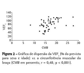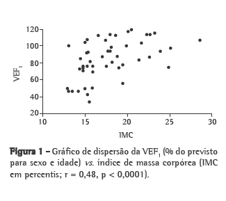 A relação moderada encontrada entre o estado nutricional e a VEF1 (Figuras 1 e 2) nos pacientes deste estudo provavelmente ocorreu porque a queda da função pulmonar não é explicada unicamente pelo aumento do comprometimento do estado nutricional. As faltas de aderência ao tratamento e à fisioterapia respiratória regular são exemplos de outros fatores que interferem na manutenção da função pulmonar.