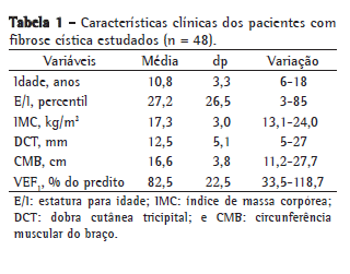 Trata-se de um estudo descritivo transversal com 48 crianças e adolescentes com FC, segundo os critérios diagnósticos do consenso da Cystic Fibrosis Foundation.(9) Os critérios de inclusão para o estudo foram os seguintes: ter idade entre 6 e 18 anos e estar em acompanhamento no Ambulatório de Nutrição do Instituto Fernandes Figueira (IFF) da Fundação Oswaldo Cruz. Pacientes com diabetes ou com doença hepática foram excluídos do estudo. O projeto de pesquisa foi aprovado pelo Comitê de Ética e Pesquisa do IFF, e todos os responsáveis pelos pacientes assinaram o termo de consentimento livre e informado.
