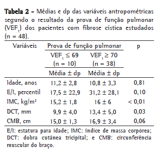Vários estudos demonstram que o IMC é um método mais sensível do que o índice de peso para estatura.(4,17,21,22) Neste estudo, ele apresentou uma associação estatisticamente significativa com a função pulmonar. Porém, esta medida não deve ser usada isoladamente para avaliar o estado nutricional desses pacientes, porque não determina a composição corporal.