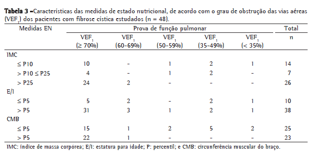 Todos os pacientes com obstrução moderada ou grave da função pulmonar possuíam desnutrição pelo critério da CMB (Tabela 3). Este resultado já era esperado, pois a literatura é unânime em afirmar que a inflamação e a infecção pulmonar aumentam o gasto energético e se tornam uma das principais causas de depleção nutricional, principalmente de massa muscular, mesmo nos pacientes com ingestão adequada ou acima do recomendado.(2,5,14,15)