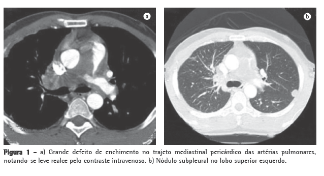 Relato de casoHomem de 45 anos de idade procurou o Hospital Madre Teresa de Belo Horizonte (MG) para a realização de angiotomografia de tórax como seguimento de TEP recorrente. Queixava-se de dispneia iniciada há dois anos, evoluindo de forma lenta e progressiva, associada a emagrecimento, aproximadamente de 20 kg, e febre ocasional, de até 38,5°C. Referia extensa propedêutica anterior e o diagnóstico de TEPC associado à hipertensão pulmonar. Estava em uso de anticoagulante oral e, iniciado há um mês, sildenafil 25 mg duas vezes ao dia, referindo melhora parcial do estado geral com essas medicações. Devido ao grau de dispneia, o paciente foi hospitalizado - classe funcional III, de acordo com a escala da Organização Mundial de Saúde (OMS). O paciente apresentava taquipneia (24 ciclos/min), SaO2 de 93% em ar ambiente e em repouso, taquicardia (113 bpm) e edema de membros inferiores. A pressão arterial era de 140/80 mmHg, havia turgência jugular (4+/4), e a ausculta cardíaca revelava terceira bulha em borda esternal esquerda inferior e sopro sistólico em foco pulmonar. O fígado estava palpável a 4 cm do rebordo costal direito.
