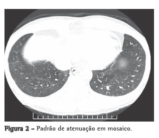 O ecodopplercardiograma transtorácico, previamente realizado, mostrava aumento moderado das câmaras direitas, e a pressão sistólica da artéria pulmonar (PSAP) foi estimada em 76 mmHg. O ecocardiograma transesofágico demonstrou extensa trombose em tronco da artéria pulmonar e PSAP de 57 mmHg. Ao estudo ultrassonográfico dos membros inferiores, não havia sinais de trombose venosa profunda. A cintilografia pulmonar perfusional, realizada durante a internação, mostrava hipocaptação na projeção dos segmentos anterior e apical posterior do pulmão esquerdo e o pulmão direito não fora visualizado. No estudo angiotomográfico de tórax, verificava-se grande defeito de enchimento no trajeto mediastinal pericárdico do tronco e das artérias pulmonares, notando-se realce dessa estrutura pelo contraste intravenoso (Figura 1a). Havia também nódulos predominantemente periféricos à esquerda (Figura 1b), espessamento dos septos interlobulares e peribroncovasculares à direita, associado com consolidação no lobo superior, moderado derrame pericárdico e padrão de perfusão em mosaico (Figura 2).