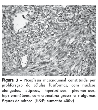 Os cortes histológicos mostraram neoplasia mesenquimal constituída por proliferação de células fusiformes, com núcleos alongados, atípicos, hipertróficos, pleomórficos, hipercromáticos, com cromatina grosseira e algumas figuras de mitose. O citoplasma era pouco evidente. Havia raros focos de necrose e de hemorragia (Figura 3). A lesão era bem delimitada em relação ao parênquima pulmonar circunjacente que não mostrava alterações relevantes.