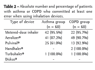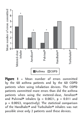 The patients with COPD committed more errors than did those with asthma. One possible explanation for this fact is that many of the asthma patients were assessed in an outpatient clinic specializing in asthma, where care is provided exclusively by residents in pulmonology. In contrast, the COPD patients were treated by residents in pulmonology and in general clinical medicine. This theory is corroborated by the responses to the questionnaire. Those responses demonstrated that the asthma patients received better counseling about the use of inhaled medications. Other possible explanations include the differences between the two groups in their characteristics, such as age, socioeconomic conditions and duration of the disease. Further studies are needed to clarify this issue. Although the COPD patients committed more errors than did the asthma patients, the latter also showed inappropriate technique for using inhalation devices.