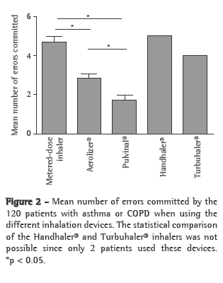 Regarding the devices tested, the number of errors in the use of the metered-dose, Aerolizer® and Pulvinal® inhalers, in this sequence, was found to be greater. Due to the small number of patients who used Turbuhaler® and Handhaler® inhalers, the results regarding these devices should be analyzed with caution. Despite the difference in the number of errors in the use of the devices, it is not possible, in the present study, to establish a correlation between this finding and the clinical control of patients. If possible, the use of different devices for a single patient should be avoided.(27)