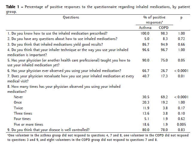 The results shown demonstrate that the technique for using inhalation devices among asthma patients and COPD patients treated at a tertiary teaching hospital is inappropriate. The fact that the patients tended to always respond that they knew how to use the devices seems to be responsible for a vicious cycle, in which the patients claim to know how to do it and the team, believing it to be true, do not test them. This explanation is reinforced by the low number of physicians who evaluate and, most importantly, reevaluate the technique for using inhalation devices. It is of note that, at out facility, no health care professionals other than physicians evaluate patient technique for using inhaled medications, and there is no structured education program for patients. Other factors, such as the socioeconomic level of the patients and the fact that the couseling is performed by resident physicians in training, might have contributed to the use of inappropriate technique.