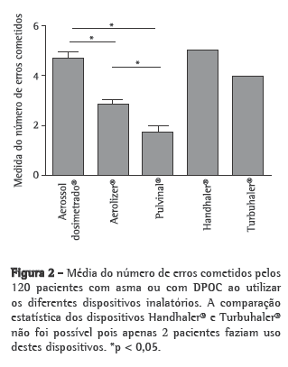 Dos dispositivos testados, foi encontrado um maior número de erros no uso de aerossol dosimetrado, Aerolizer® e Pulvinal®, nessa ­sequência. Devido ao pequeno número de pacientes que faziam uso de Turbuhaler® e Handhaler®, os resultados referentes a esses dispositivos devem ser analisados com cautela. Apesar da diferença no número de erros no uso dos dispositivos, não é possível, neste estudo, relacionar esse achado com o controle clínico dos pacientes. Se possível, deve-se evitar a utilização de dispositivos diferentes para um mesmo paciente.(27)