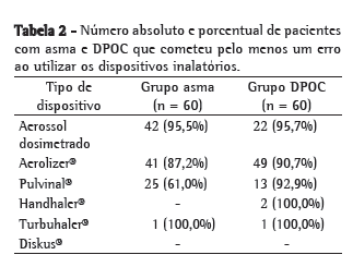Todos os pacientes com asma e quase todos (98%) com DPOC relataram conhecer a técnica adequada de utilização dos dispositivos inalatórios. Apesar disso, a maioria dos pacientes (94,2%), tanto os asmáticos como os com DPOC, cometeu pelo menos um erro na utilização dos dispositivos, demonstrando o uso de técnica insatisfatória e a discrepância entre a compreensão do paciente e seu conhecimento prático real.