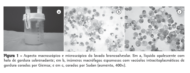 Atualmente, o LBA é considerado o método diagnóstico da PL.(5) O aspecto macroscópico opalescente com halo de gordura sobrenadante do LBA já é um forte indício de PL; entretanto, somente o exame citoquímico com Sudan, que cora em laranja a gordura presente no meio extracelular e nos vacúolos citoplasmáticos dos macrófagos, confirma o diagnóstico. Todas as crianças deste estudo tiveram diagnóstico de PL confirmado pelo LBA.