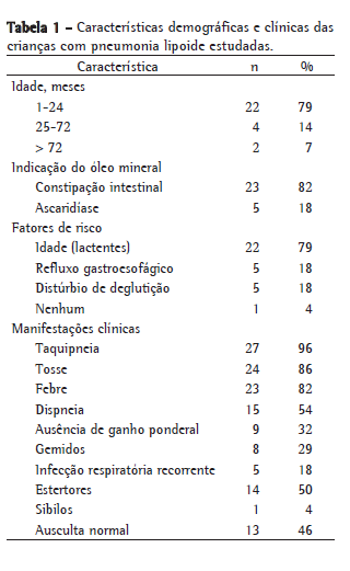 A apresentação clínica da PL nos adultos é oligo ou assintomática, e geralmente o diagnóstico é um achado radiológico. Em contraste, as crianças comumente apresentam quadro aspirativo agudo e disseminado, evoluindo com insuficiência respiratória e eventualmente óbito.(3,9,19,20) Neste estudo, taquipneia, tosse e febre foram as manifestações clínicas mais frequentes. Gemidos tiveram relação com a idade (lactentes) e com a extensão do envolvimento pulmonar. A presença de óleo nos pulmões predispõe a infecções recorrentes, inclusive por germes atípicos, ativando a liberação de mediadores inflamatórios pelos macrófagos alveolares e determinando febre, leucocitose, neutrofilia e aumento de velocidade de hemossedimentação.(6,18) Essas alterações estavam presentes na maioria das crianças estudadas, provavelmente confundindo o diagnóstico com pneumonia bacteriana.