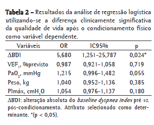 Objetivo: Investigar os fatores associados à diferença clinicamente significativa da qualidade de vida (DCSQV) após condicionamento físico em pacientes com DPOC. Métodos: Trinta e cinco pacientes foram submetidos a 12 semanas de condicionamento físico, envolvendo treinamento de força e exercício aeróbio leve. Composição corporal, teste incremental e de endurance em esteira, teste de caminhada de seis minutos, força muscular periférica, PImáx, baseline dyspnea index (BDI) e Saint George's Respiratory Questionnaire (SGRQ) foram avaliados antes e após o treinamento, e suas alterações (Δ) foram calculadas. A DCSQV foi definida como a redução ≥ 4% no escore total do SGRQ. Os pacientes que responderam ao treinamento, apresentando DCSQV, foram alocados no grupo respondedores (R; n = 24), e os demais pacientes foram alocados no grupo não-respondedores (NR; n = 11). Resultados: Os seguintes resultados foram significativamente maiores no grupo R que no grupo NR (p < 0,05): VEF1 (1,48 ± 0,54 L vs. 1,04 ± 0,34 L), VEF1/CVF (47,9 ± 11,7% vs. 35,5 ± 10,7%), PaO2 (74,1 ± 9,7 mmHg vs. 65,0 ± 8,9mmHg) e ΔBDI [mediana (interquartil); 2,0 (0,0-3,5) vs. 0,0 (0,0-1,0)]. Houve correlação significativa (p < 0,01) de ΔSGRQ-sintomas (r = 0,44), ΔSGRQ-atividade (r = 0,62) e ΔSGRQ-total (r = 0,60) com ΔBDI. Após regressão logística, apenas ΔBDI foi selecionado como determinante da DCSQV. Conclusões: A DCSQV após o condicionamento físico está associada principalmente à redução da dispneia nos pacientes com DPOC. Portanto, são necessárias estratégias de tratamento visando interromper o ciclo dispneia-sedentarismo-dispneia nesses pacientes.