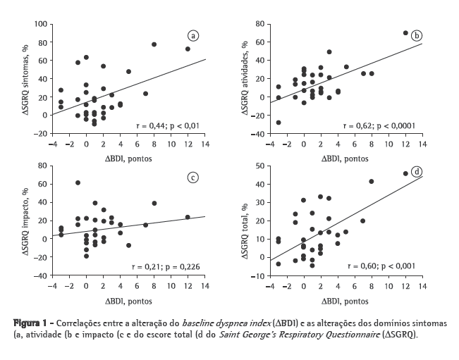 A comparação das características basais entre os grupos R e NR antes do início do programa de condicionamento físico, mostrou que o VEF1, a VEF1/CVF e a PaO2 foram significativamente superiores no grupo R (Tabela 1). A mediana (percentil 25% - percentil 75%) da diferença na sensação de dispneia entre o início e o final do programa de reabilitação (ΔBDI) foi significativamente superior no grupo R [R = 2 (0-3,5) vs. NR = 0 (0-1); p = 0,023]. Além disso, o peso corporal (R = 71,0 ± 12,5kg vs. NR = 62,5 ± 14,12 kg; p = 0,083) e a PImáx (R = −73,4 ± 23,1 cmH2O vs. NR = −57,7 ± 23,9 cmH2O; p = 0,074) mostraram tendência de valores basais superiores no grupo R. A Figura 1 apresenta as correlações entre ΔSGRQ e ΔBDI. ΔBDI apresentou correlações positivas significativas com ΔSGRQ-sintomas, ΔSGRQ-atividade e ΔSGRQ-total. Utilizando-se ΔBDI, VEF1 (% do previsto), PaO2, peso corporal e PImáx como variáveis independentes na análise de regressão logística, apenas o ΔBDI foi selecionado como determinante da DCSQV no escore total do SGRQ (Tabela 2).
