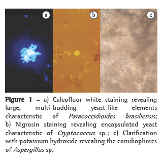 Direct examination consists in microscopically evaluating the clinical sample, placed between the slide and the coverslip, using reagents or stains to visualize fungal structures. Direct examination is conclusive for the diagnosis of certain pulmonary mycoses, such as pneumocystosis, paracoccidioidomycosis (Figure 1a), cryptococcosis (Figure 1b) and fungus ball caused by Aspergillus (Figure 1c). However, in most cases, direct examination does not suffice to identify the etiologic agent.