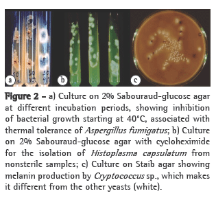 Other specific culture media can be used in cases of evident clinical suspicion, such as sterilized bread for zygomycosis etiologic agents and Staib agar (seeds of Guizotia abyssinica) for Cryptococcus sp. in specimens obtained from the bronchial tree (Figure 2C).(6) The incubation period and the temperature also depend on the etiologic agent to be isolated. In general, yeast-like and filamentous fungi present rapid growth, being isolated in up to one week, whereas dimorphic fungi need a longer incubation period (two to three weeks for H. capsulatum and P.
