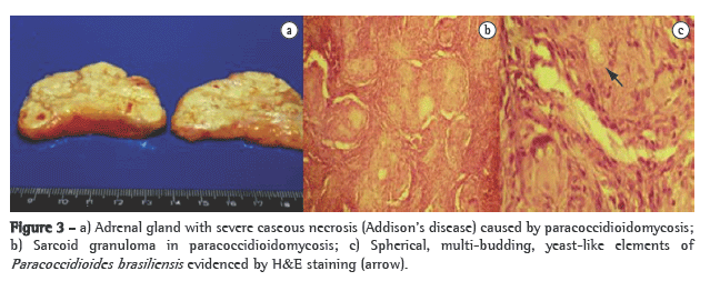 One characteristic of infectious diseases is the tissue tropism presented by the different etiologic agents (Table 4). This characteristic is especially observed in cases of cryptococcosis, histoplasmosis and paracoccidioidomycosis, in which the etiologic agents affect, respectively, the central nervous system, the monocytic/macrophagic system (liver, spleen, ganglia and bone marrow) and the adrenal gland (Figure 3a). Angiotropism is observed in cases of aspergillosis, hyalohyphomycosis and zygomycosis, causing thrombotic angiitis.(22,25,26)