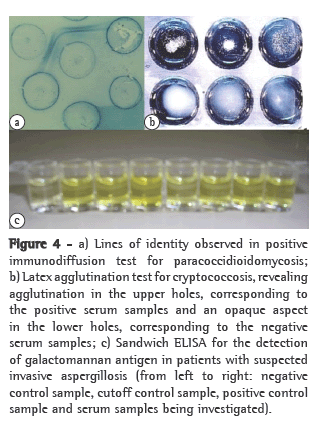 Specific tests have been developed to aid the conventional methods commonly used in mycology. One of the tests recently approved by the Brazilian National Health Products Oversight Agency is the sandwich ELISA technique, developed to detect galactomannan, a hydrosoluble polysaccharide present in the cell wall of fungi of the genus Aspergillus that is released in the blood during hyphae growth in the host tissues (Figure 4C).(37,38) This technique can detect low concentrations of galactomannan (0.5 ng/mL) in clinical samples and is commercially available (Platelia Aspergillus EIA; Bio-Rad, Hercules, CA, USA). Sandwich ELISA yields fast results (approximately 4 h); however, its use as a diagnostic tool is approved only for serum samples of neutropenic patients (hematologic patients or bone marrow transplant recipients). Its efficacy for other clinical specimens and for different invasive aspergillosis risk groups is currently under study.(39,40)