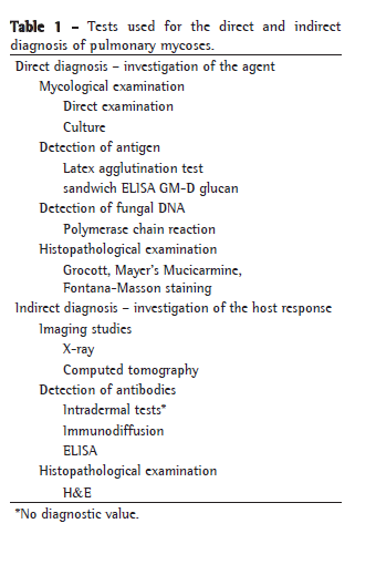 The definitive laboratory diagnosis can be made directly, by detecting the presence of the microorganism, or indirectly, by investigating the specific response of the host to the fungus (Table 1). However, it is worthy of note that laboratory findings should be interpreted considering the clinical and epidemiological history. Serological screening, histopathological examination (tissue reaction and documentation of fungal elements in the tissues) and the results of direct microscopic examination guide the correct interpretation of laboratory findings and the initial therapeutic decision. The results of cultures can corroborate or change this decision.(4) The microbiologist should inform the physician whether the test results are sufficient to guide the therapeutic actions. The ideal combination to diagnose a pulmonary fungal infection should include the following: