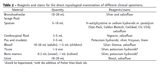 Tissue fragments, sputum and BAL fluid can be analyzed by adding a solution containing 20% potassium hydroxide, with or without Parker blue-black ink, calcofluor white or nigrosin (Figure 1). Pus, blood, exudate, BAL fluid and organ aspirate smears can be fixed and stained with Giemsa or Grocott staining (Table 2).