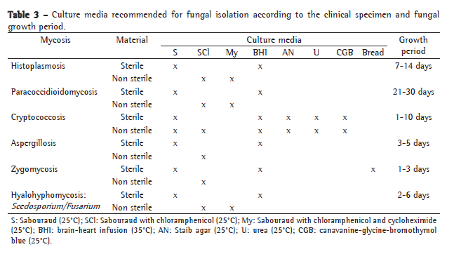 brasiliensis). With regard to temperature, the material should ideally be incubated at 25°C and 35°C, allowing the isolation of all microorganisms and the prompt identification of thermally dimorphic fungi.(7) Table 3 shows the culture media most frequently used in clinical mycology.
