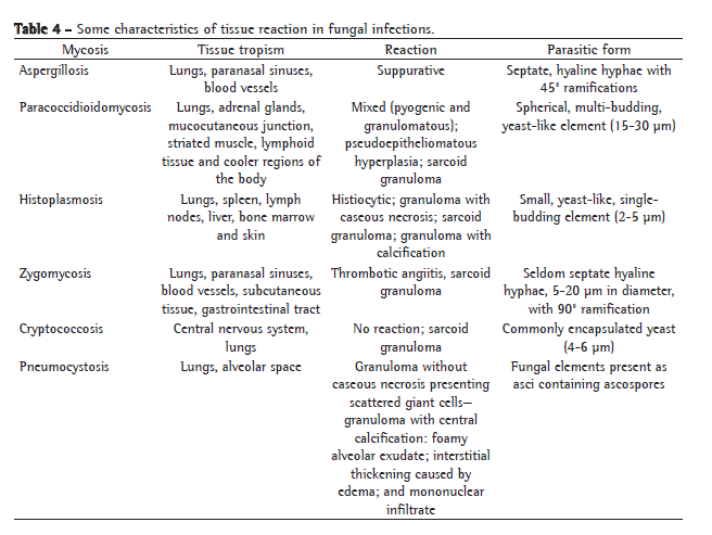 Although tissue reaction is nonspecific for the diagnosis of fungal infections and varies according to the individual, the location and the duration of infection, certain reactions are more commonly observed in specific types of mycoses (Table 4). An acute or chronic pyogenic reaction with neutrophilic infiltrate (abscess) is commonly seen in cases of invasive aspergillosis, but can also be observed, as a rule, in cases of actinomycosis, nocardiosis and rhodococcosis; therefore, these bacterial infections should be included in the differential diagnosis. A mixed, pyogenic and granulomatous reaction with pseudoepitheliomatous hyperplasia is commonly seen in cases of paracoccidioidomycosis. Histiocytic granuloma with Langhans giant cells and central necrosis (tuberculous granuloma with caseous necrosis) is characteristic of histoplasmosis, especially in its acute pulmonary form. Sarcoid granuloma can be seen in cases of paracoccidioidomycosis (Figure 3b), cryptococcosis and histoplasmosis, which is extremely relevant; therefore, these diseases should be ruled out before confirming the diagnosis of sarcoidosis, a diagnosis based on the exclusion of other possible diagnoses. Fibrotic granuloma with caseous necrosis, frequently diagnosed by means of imaging techniques, such as a nodule(s) in the pulmonary cortex, can be observed in cases of paracoccidioidomycosis, cryptococcosis and histoplasmosis. In cases of histoplasmosis, the fibrotic granuloma with caseous necrosis is usually calcified.(21-23)