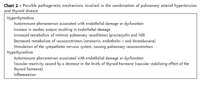 The possible pathogenetic mechanisms suggested for the combination of PAH and Graves' disease are the following: autoimmune phenomenon associated with endothelial damage or dysfunction; increased cardiac output, resulting in endothelial damage; and increased metabolism of intrinsic pulmonary vasodilators.(6)
