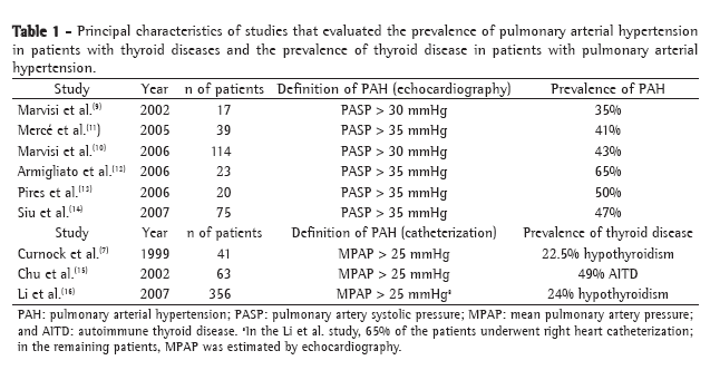 Various diseases, such as portal hypertension, hemoglobinopathies, collagen diseases and HIV infection, are associated with PAH. Recent studies have suggested an association between PAH and thyroid diseases (hypothyroidism and hyperthyroidism).(6-23) Since the Third World Conference on Pulmonary Hypertension, held in 2003, thyroid diseases have been classified as diseases associated with PAH.(2)
