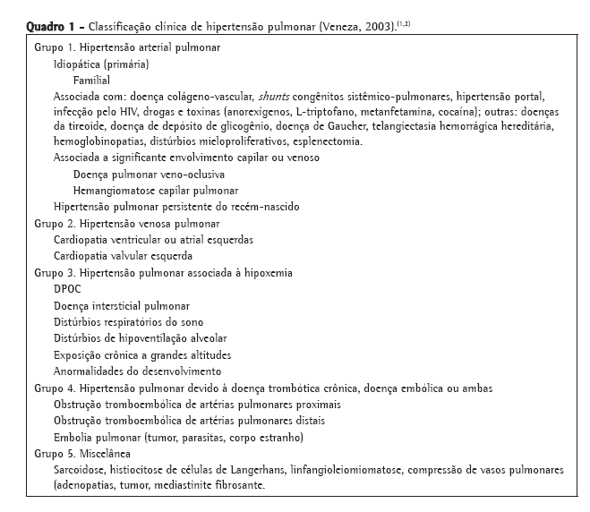 Hipertensão arterial pulmonarA hipertensão arterial pulmonar (HAP) é caracterizada pela elevação sustentada da pressão arterial pulmonar e aumento progressivo na resistência vascular pulmonar, levando à insuficiência ventricular direita e morte prematura.(1) A hipertensão pulmonar era classicamente dividida em primária (idiopática) e secundária. Entretanto, há condições dentro da categoria de HAP secundária que se assemelham a HAP primária, tanto nas características histopatológicas como também na resposta ao tratamento. A Organização Mundial de Saúde tem oferecido periódicas classificações de HAP, sendo a atual fruto de uma reunião de consenso realizada em Veneza em 2003 (Quadro 1).(1-3) Uma nova classificação está prevista para este ano.