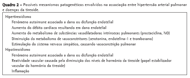 A HAP está associada a diversas doenças, tais como hipertensão portal, hemoglobinopatias, doenças do colágeno, infecção pelo HIV, entre outras. Estudos recentes têm sugerido uma associação entre HAP e tireoidopatias (hipotireoidismo e hipertireoidismo).(6-23) A partir da Terceira Conferência Mundial sobre Hipertensão Pulmonar, realizada em 2003, as doenças da tireoide foram classificadas como doenças associadas à HAP.(2) Entretanto, a natureza dessa associação não está bem estabelecida, apesar de alguns mecanismos patogenéticos terem sido propostos (Quadro 2).