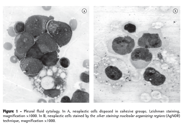 Eight months after the surgery, the patient presented local recurrence (right axilla) and metastasis to the lung. He evolved with progressive dyspnea and pain at the left coxofemoral joint. Physical and radiological (chest CT) examination evidenced voluminous right-sided pleural effusion, with numerous pleural nodules. The effusion was drained, and the pleural fluid analysis showed characteristics of exudate (proteins: 4.2 g/dL and lactate dehydrogenase: 2,456 UI/L)(Figure 1). The tomography study of the abdomen and pelvis showed tumor metastasis in bone and right iliac muscle. Bone marrow aspirate showed bone marrow infiltration. At this writing, the patient was still under treatment with palliative chemotherapy.