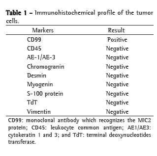 In the present case, only CD99 was positive. However, the clinical status and the morphological and structural aspect of the tumor cells were fundamental for the diagnostic definition.