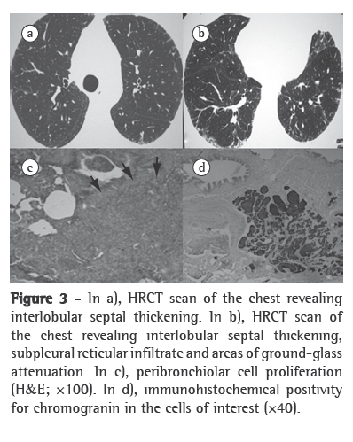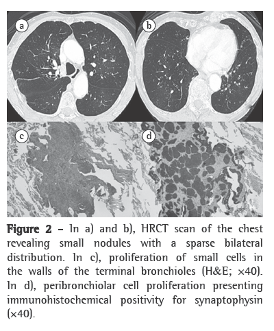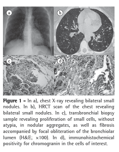 The histological findings revealed proliferation of small cells, without atypia, located in the airway walls and forming nodular aggregates that tested positive for epithelial markers (carcinoembryonic antigen and CK7) and neuroendocrine markers (chromogranin and synaptophysin), as determined by immunohistochemistry (Figure 1d). There was concomitant fibrosis, accompanied by focal obliteration of the bronchiolar lumen, as well as mild chronic inflammatory infiltrate and focal bronchiolectasis.