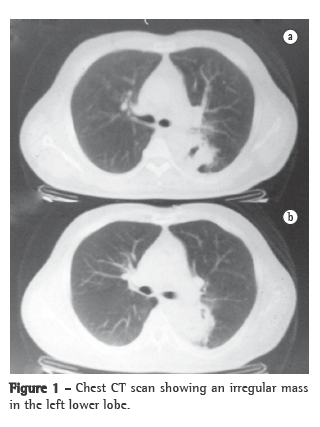 The differential diagnosis should include benign and malignant tumors, as well as infectious diseases that can produce tumors, such as TB, paracoccidioidomycosis, histoplasmosis, cryptococcosis and aspergillosis.(4) This rare clinical form was the one that best fit our case report. Due to the similarity in presentation, with the negative culture results for TB bacillus and fungi, and the fact that the patient presented risk factor for lung cancer, our diagnostic reasoning lead to the confirmation of that pathology.