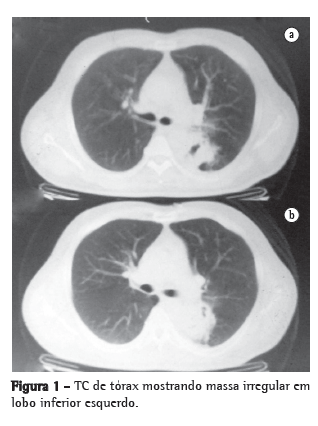 Foi avaliado, inicialmente, pela cardiologia, por suspeita de síndrome coronariana aguda e, após exclusão da mesma (através de eletrocardiograma, ecocardiograma e resultados normais para enzimas cardíacas), a propedêutica seguiu em direção a diagnósticos diferenciais. O hemograma mostrava poucos eosinófilos (2%; 130 células). A radiografia e TC de tórax mostraram massa irregular em segmento superior do lobo inferior esquerdo, envolvendo o brônquio principal esquerdo, sem acometimento de linfonodos (Figura 1). A fibrobroncoscopia com biópsia transbrônquica não evidenciou alterações na árvore brônquica, e o exame anatomopatológico foi normal.
