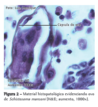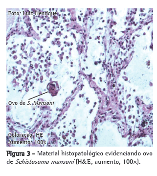 Inicialmente, tentou-se descartar TB e micoses pulmonares. Tanto a pesquisa de bacilo da TB quanto à de fungos no lavado broncoalveolar (LBA) foram negativas. A cultura do LBA para bacilo da TB e outras bactérias foi negativa. Optou-se, então, por pleuroscopia com biópsia. O exame histopatológico do material evidenciou tecido pulmonar com acentuada fibrose e intenso processo inflamatório crônico; diversos granulomas com supuração central, contendo inúmeros eosinófilos, várias células gigantes multinucleadas de tipo corpo estranho e raros ovos de S. mansoni degenerados, além de depósitos de fibrina e áreas de antracose e hemossiderose (Figura 2).