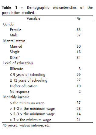 Of the 387 smokers investigated, 30% were from the city of Botucatu, 48% were from nearby cities and 22% were from other cities in the state of São Paulo. Mean age was 50 ± 25 years (age bracket: 19-74 years). The demographic characteristics of the studied population are shown in Table 1. Most patients were female (63%), married (50%) and had only eight or fewer years of schooling (61%). In addition, more than half of the subjects had a monthly income of less than two times the national minimum wage.