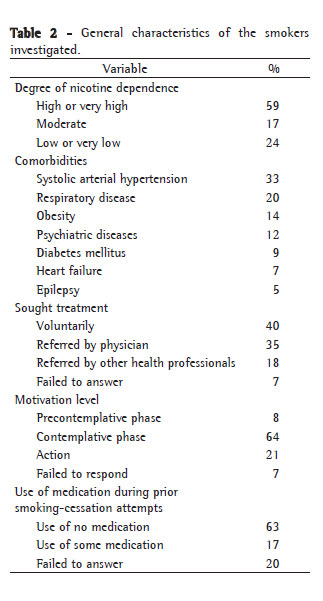 The results of the present study show that most of the subjects who sought treatment for nicotine dependence were female and had a low level of education, as well as presenting a low monthly income, a high or very high level of nicotine dependence and a long history of smoking. Although a large proportion of the patients had made prior smoking-cessation attempts, they had most often done so without participating in structured counseling sessions or receiving medication to treat the dependence, which is in discordance with the smoking cessation guidelines. In addition, the results of the present study show that most of the subjects presented comorbidities, which underscores the importance of smoking cessation.