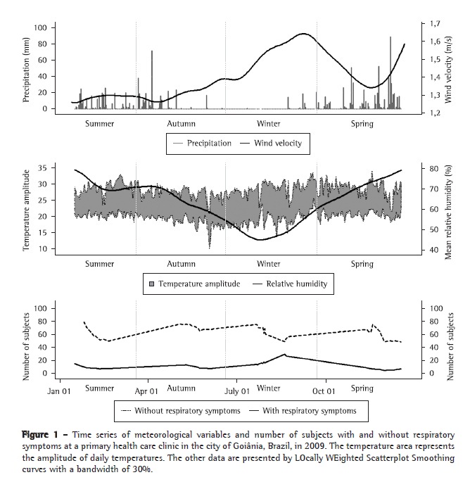 The dependent variables of the study were the number of subjects with respiratory symptoms and the proportion of subjects with respiratory symptoms in relation to the total number of subjects who sought outpatient treatment at the PHC clinic on each observation day. To investigate a possible late effect of the meteorological variables, we generated variables for minimum temperature and relative humidity that described the patterns observed one to five days prior to each day of cross-sectional observation. The variables "previous minimum temperature" and "previous minimum relative humidity", both created on the basis of the mean minimum humidity or minimum temperature values recorded three days prior to the days of cross-sectional observation, were selected for use because they correlate better with the dependent variables. The chi-square test was used for the analysis of dichotomous variables. Fisher's exact test was used for the validation of the random distribution of the cross-sectional observations in relation to weekdays and weekends, and ANOVA was used for the comparison of the means of the dependent variables in each season. Pairwise correlation analysis was performed between each dependent variable and each meteorological variable. The effects of the meteorological variables were analyzed with a Poisson multivariate regression model, with logarithm as link function, and with an AutoRegressive Moving Average with eXogenous input (ARMAX) model. To analyze trends, we used LOcally WEighted Scatterplot Smoothing (LOWESS) regression with a standard bandwidth of 30%. The results were analyzed with the STATA program, version 11.0 (Stata Corp, College Station, TX, USA). For all tests, values of p < 0.05 were considered statistically significant. The study was approved by the Human and Animal Research Ethics Committee of the Federal University of Goiás Hospital das Clínicas (Protocol no. 142/2008). An explanation of the statistical method used in the present study is described in detail in the online supplement of the journal