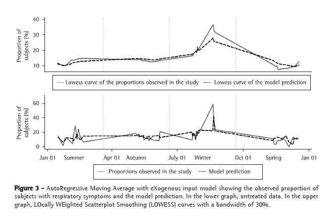 The ARMAX model fit in the present study reflects the significant effect of the variable "previous minimum relative humidity". Because this variable yielded a good prediction of the proportion of subjects with respiratory symptoms who sought treatment at the PHC clinic over the year, it is important to consider these results in public health. Because most of Brazil has a semi-humid tropical climate, with well-defined wet and dry seasons and small temperature variations, the major meteorological variable related to respiratory symptoms is relative humidity. In order to mitigate the deleterious effects of this seasonal variable, health education policies, aimed at instructing the population and reducing the effects of low humidity on the airway, should be reinforced in the dry season. In addition, since climatic conditions can be predicted, the increase in the demand on the health care system in relation to respiratory diseases can be anticipated, this being in agreement with the WHO recommendation, which stimulates the development of models that can predict an increase in diseases, because, if these models show good accuracy, they can be invaluable in fighting and preventing epidemics.(3)