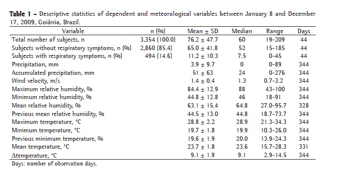 In this study, 44 cross-sectional observations were performed between January 8 and December 17, 2009, 11 in each season. All patients who sought outpatient treatment at the PHC clinic were invited to participate in a survey evaluating the occurrence of respiratory symptoms. Climate data were obtained from meteorological instruments at the Central Station of the Meteorology and Hydrology System of the state of Goiás. The meteorological instruments used were under automatic operation and were located in the urban area of Goiânia, thereby reflecting the climatic conditions in the city.