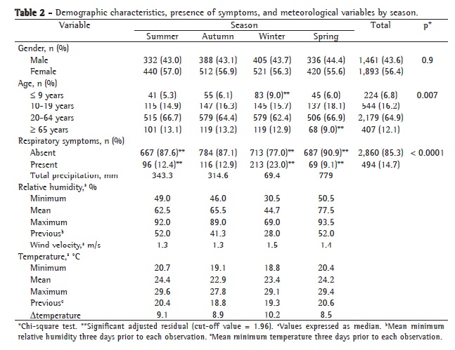 The most common symptom was cough, present in 439 subjects (88.9%), followed by breathlessness, in 281 (56.9%), and noisy breathing, in 185 (37.5%). Female patients predominated (56.4%), with no statistically significant differences among seasons. There were statistically significant differences in the age distribution among seasons when the subjects were divided as follows: children (5-9 years of age); adolescents (10-19 years of age); adults (20-64 years of age); and elderly subjects (≥ 65 years; p = 0.007). The age distribution showed a predominance of children in winter and a reduced number of elderly subjects in spring. There were statistically significant differences in the presence or absence of respiratory symptoms among seasons (p < 0.0001). Respiratory symptoms were more common in winter and less common in spring. The median precipitation, the median relative humidity, and the median minimum temperature were lower in winter, whereas the median wind velocity was higher in winter. The median maximum temperature, the median mean temperature, and the median previous minimum temperature were lower in autumn. The t was higher in winter (Table 2). Fisher's exact test was used for the validation of the random distribution of the cross-sectional observations in relation to weekdays and weekends. The test revealed that there were no statistically significant differences when the observations were arranged in a contingency table by day of the week (Monday through Sunday) in relation to the four seasons of the year (p = 0.14).