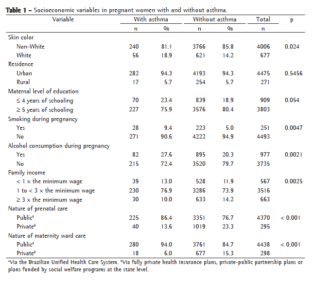 Various aspects can influence the development and expression of asthma or can be influenced by it, adversely or not.(2) Such aspects include markers of maternal and fetal health, ranging from maternal socioeconomic status to obstetric data, intrauterine growth parameters, neonatal vitality and neonatal prognosis.(3)