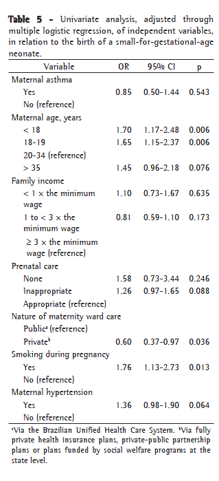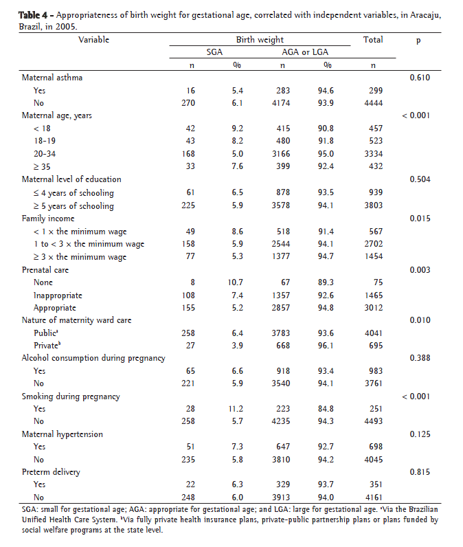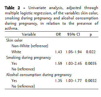 Multivariate logistic regression was used for the following variables: skin color; consumption of alcoholic beverages during pregnancy; smoking during pregnancy; and SGA birth. In order to analyze the appropriateness of birth weight for GA, we first studied the effect that each independent variable had on the birth of an SGA neonate, separately, comparing the proportions by means of the chi-square test. Based on the results, we selected the variables to include in the multiple logistic regression model, which was adjusted for the remaining independent variables, thereby determining the correlation between asthma and the birth of an SGA neonate.